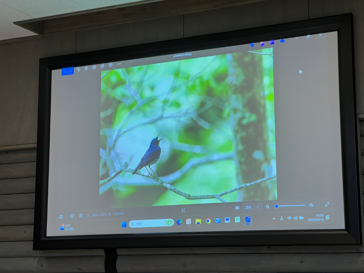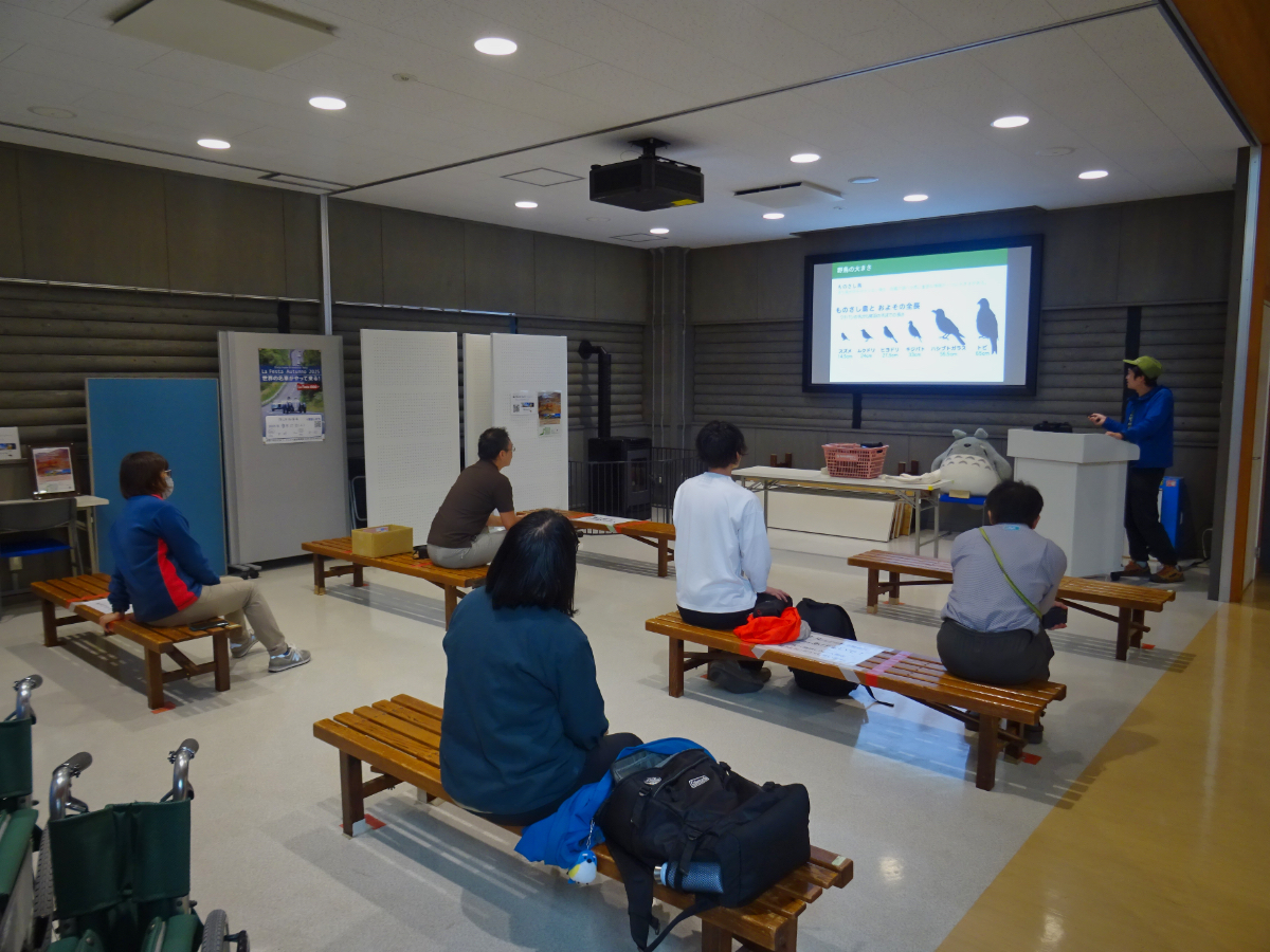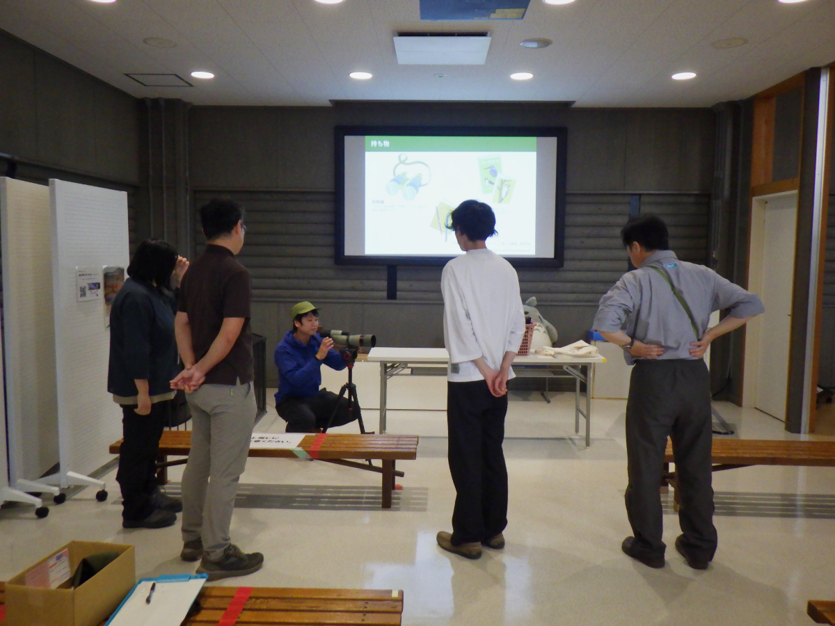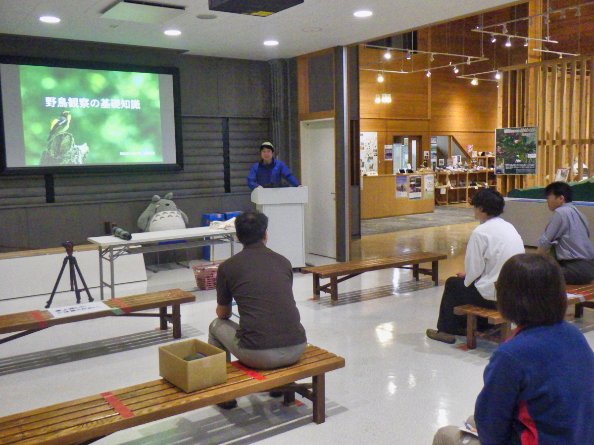 浄土平は朝から雷雨、豪雨、強風という悪天候となり、残念ながら、お申込みされていた一般参加者の皆様はすべてキャンセルとなってしまいましたので、福島市小鳥の森の増渕翔太さんを講師に、浄土平ビジターセンター2名、裏磐梯ビジターセンター3名という近隣?自然系施設3館のスタッフが参加する「勉強会」のような形で 約2時間半、屋内で 野鳥観察の基礎をはじめ、守るべきフィールドマナー、浄土平周辺で見られる野鳥の姿や鳴き声などを教えていただきました。