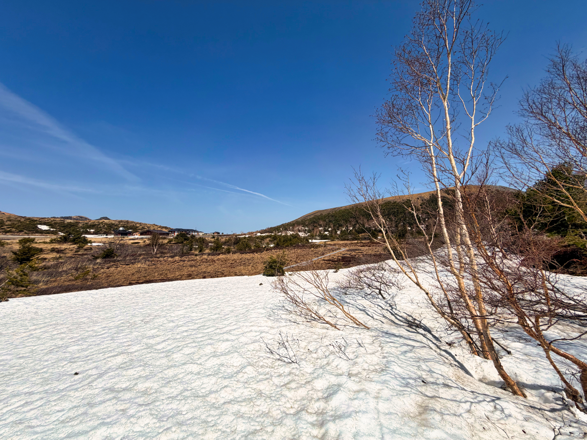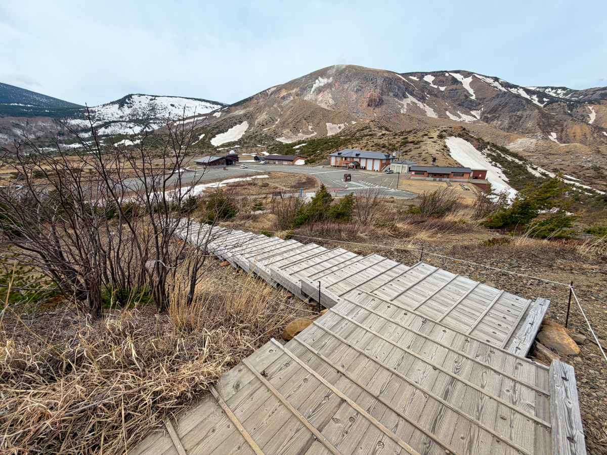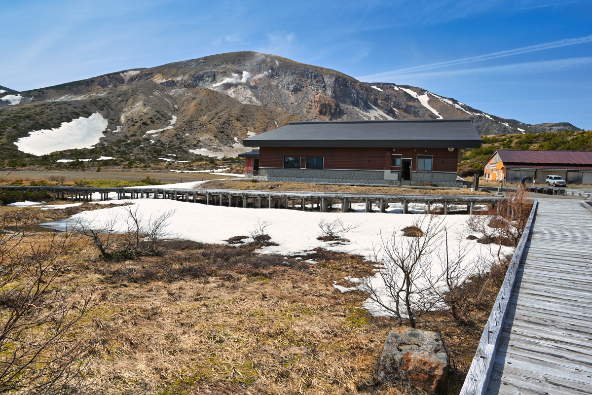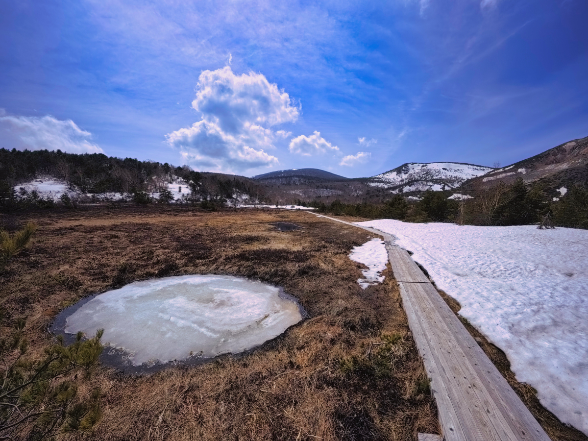 浄土平湿原一周散策コースには、桶沼(おけぬま)寄りの一部にまだ木道が残雪の下に隠れている区間があります。