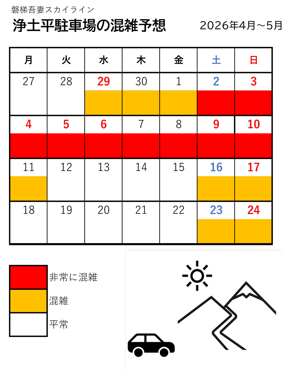 ゴールデンウィークが間近となりお出かけを予定されている方も多いと思いますが、浄土平駐車場の混雑予想カレンダーを作成しましたので参考にしてください。
